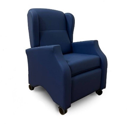 Modelo reclinável desenhado para geriatria e utilizadores com mobilidade reduzida no membros inferiores.
