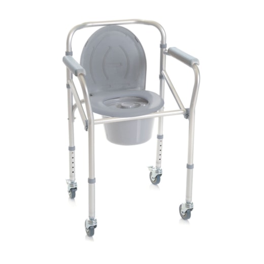Cadeira de WC com assento, altura regulável e urinol. Estrutura de alumínio regulável com apoios de braços e rodas giratórias. Cadeira ideal para o auxílio na vida diária de pessoas idosas e/ou com mobilidade que ocorre de um cuidador para se transportar para o banho. É um produto funcional e confortável com 4 funções: assento alteador para sanita, suporte para sanita, assento sanitário e assento para ducha. Apresentação de 4 variações.