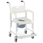 A cadeira vem incorporada com um assento acolchoado e apoios para os pés dobráveis, que facilitam as transferências dos pacientes e a acessibilidade, proporcionando um nível maior de conforto e segurança na hora do banho.