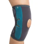 Fabricado em tecido elástico anelado e veludo elástico respirável, correias com fechos de velcro para ajuste do tamanho e compressão pretendidos, com articulações policêntricas, a zona dianteira tem um orifício para apoio da rótula e estabilização médio-lateral. A joelheira tem uma cor acinzentada com riscas verdes nos lados, que por sua vez dá um tom uni sexo e infantil à ortótese. Está disponível em dois tamanhos, e pode ser utilizada tanto na perna direita como na esquerda.