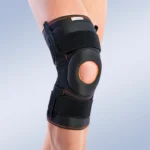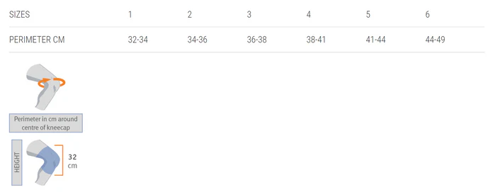 Joelheira têxtil em material elástico respirável de três camadas. Confeccionado em veludo elástico (área do joelho) e tecido elástico (área das alças). Composto por 3 camadas que se dividem em um tecido elástico a base de microfibras, espuma de poliuretano e felpo de algodão, que facilita a rápida dispersão do suor, maior elasticidade e melhor adaptação, com pontos de silicone no interior para evitar a migração da órtese. Patela aberta incluindo borda patelar, tiras médio-laterais e abertura na área poplítea.