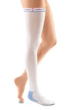 A elevada elasticidade e a malha particularmente suave e respirável proporcionam uma elevada sensação de conforto. A banda de silicone inteligente permite confirmar a escolha do tamanho adequado e proporciona uma fixação segura. O sistema de código de cores e a banda inteligente são uma ajuda importante na seleção do tamanho correto e facilitam a colocação da meia. A marca no calcanhar assegura o posicionamento correto da mediven® thrombexin® 18. O calcanhar, com uma superfície interior aveludada, reduz o risco de formação de úlceras de pressão. A malha altamente respirável permite um transporte ativo da humidade de dentro para fora, reduzindo o risco de maceração.